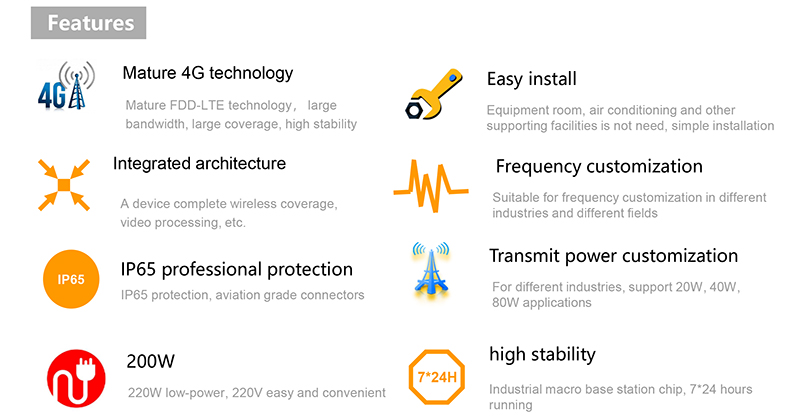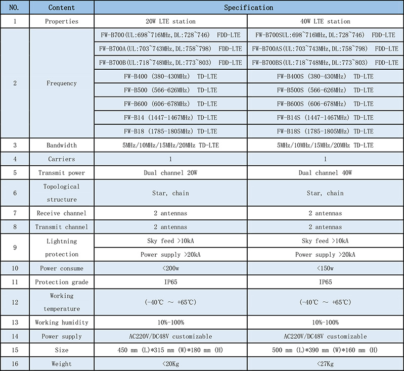 FW-B series outdoor integrated LTE base station mainly include two modules, the base station core board and the power amplifier module. The base station core board integrates a protocol processing unit (BBU), a radio frequency unit (RRU), and a core network unit (referred to as EPC). FW-BS is a 40W upgrade version. Our company can customize the transmit power and frequency according to customer requirements.