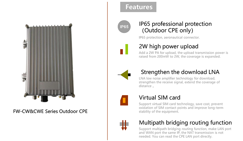The outdoor CPE designed for private network. According the different needs of customers, it is divided into 200mW and 2W. The device has the features of virtual SIM card , DT function, post-routing function and high gain WIFI.