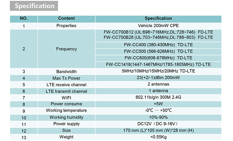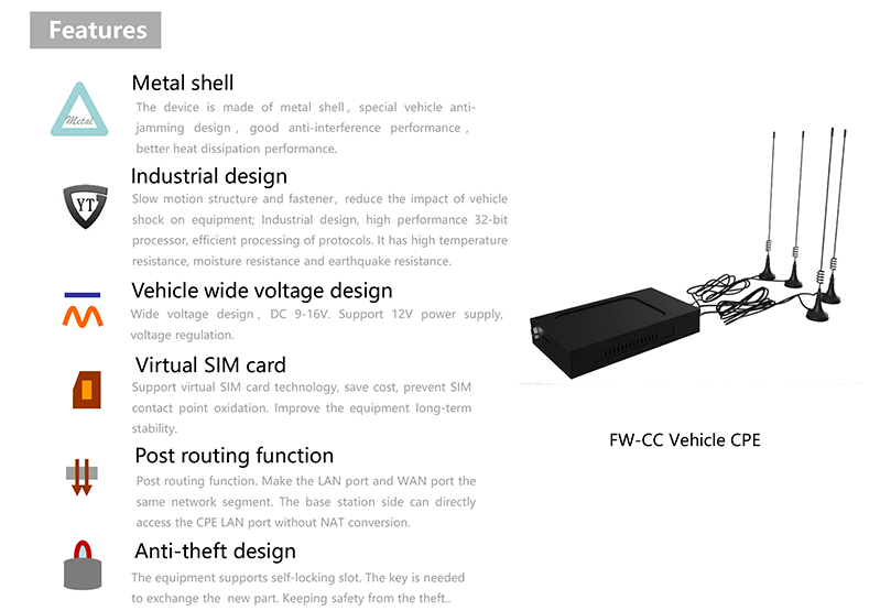The FW-CC series is an industrial grade router (CPE for short) designed for in-vehicle 4G private network. The device supports virtual SIM card function and DT(road data testing) function. The CPE supports a variety of LTE private networks, support Linux, Windows, MAC and other multi operation system.