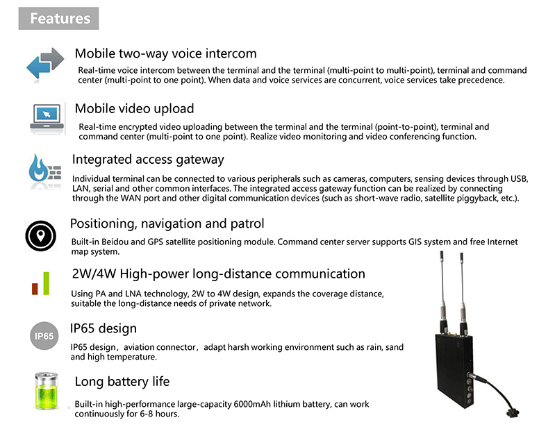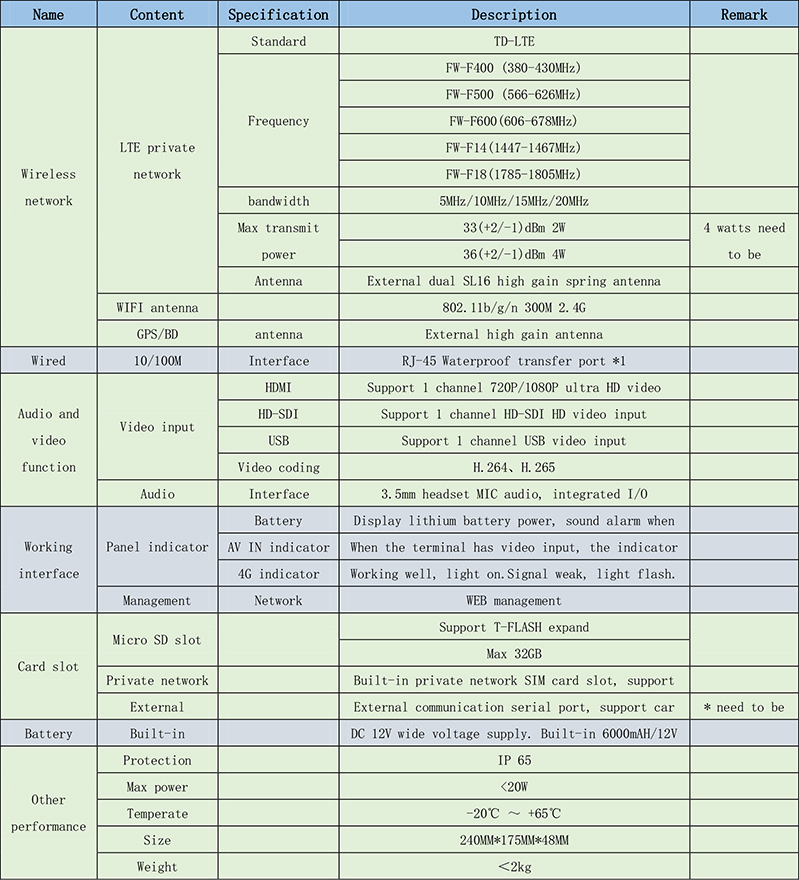 This is an outdoor three-proof high-power 4G intelligent individual terminal, it's designed for private network. It can realize the real-time transmission of Ultra HD video and audio by the 4G private network. The product has complete functions, such as superior performance, good secrecy, easy installation, easy use and easy management. It can be used as an independent communication system, also can be used as a monitoring network. It can be widely used in many fields such as video communication, video conferencing, security monitoring, etc.