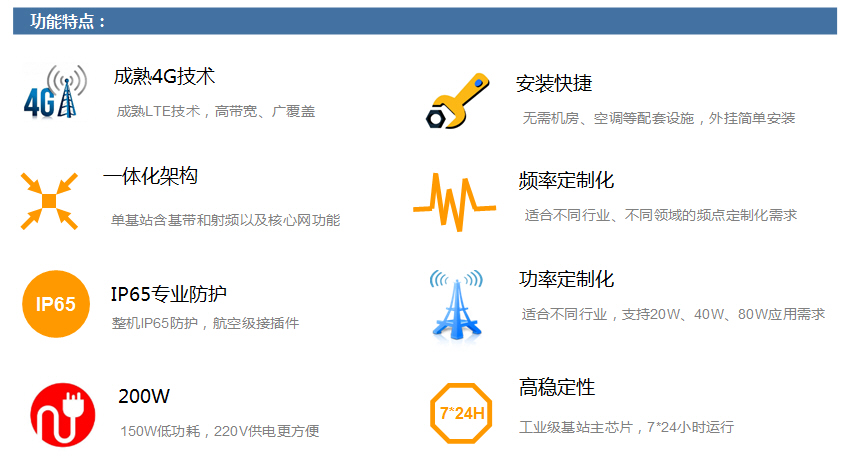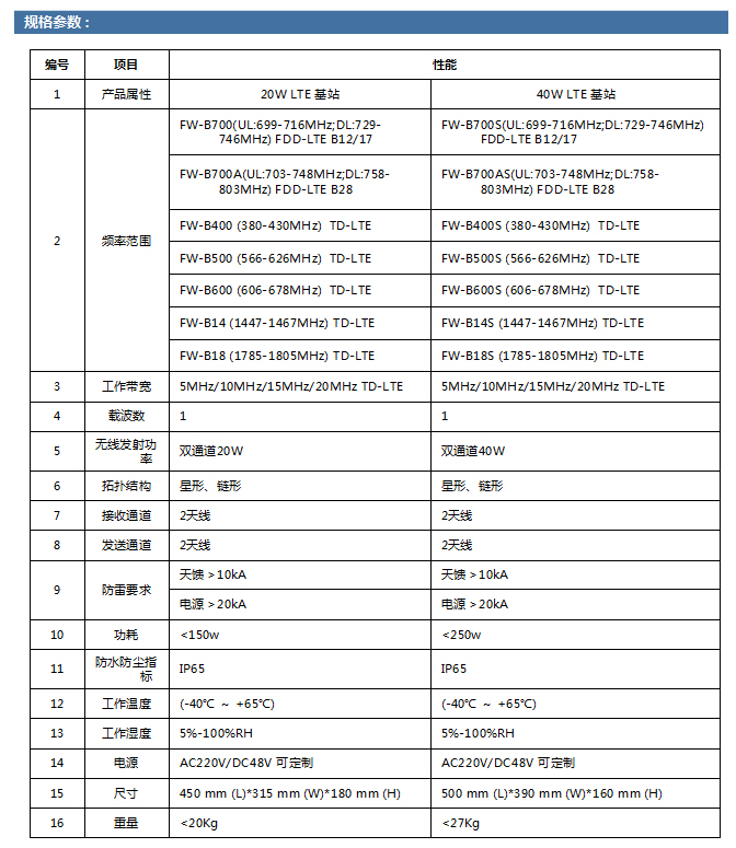 FW-B系列室外型LTE一体化基站产品(简称基站)主要包括基站核心板、功放模块两大模块。基站核心板集成了基站协议处理单元(BBU),射频单元(RRU)和核心网单元(简称EPC)。FW-BS为40W升级版本 ,我公司可根据客户需求进行功率和频率方面的定制开发。