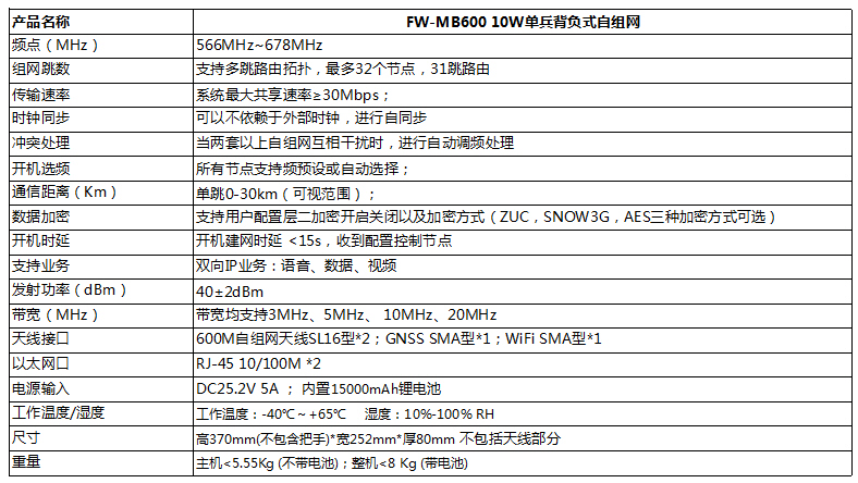 FW-MB600背负式自组网设备是一种基于LTE底层技术的自组网设备,是一种与传统无线网络完全不同的新型无线网络。它是一种动态地建立新的链接和其他节点相连的一项技术,它具有自组网、自修复、多跳级联、节点自我管理等优点,可以大幅降低网络部署的成本和复杂程度。