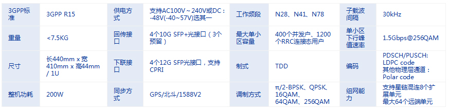 基于X86通用平台的5G主机单元(FW-BBU5000)采用白盒硬件设计,软硬件解耦,独有数据压缩算法。FW-BBU5000可连接两个核心网,实现RAN共享,最大支持4个100MHz 2T2R的5G NR小区或者2个100MHz 4T4R的5G NR小区,支持小区合并。