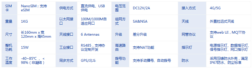 5G工业终端是一款多接口、低功耗、接入方便,满足工业环境需求的数据终端产品。支持5GNR接入方式,SA&NSA组网方式,位置拉远天线,具备优异的上传下载性能;提供RJ45网口,RS485串口,type-CUSB等接口与外部设备连接,能够为行业终端提供即插即用的5G接入能力,广泛应用于智慧工厂、智慧能源、智慧安防等领域。